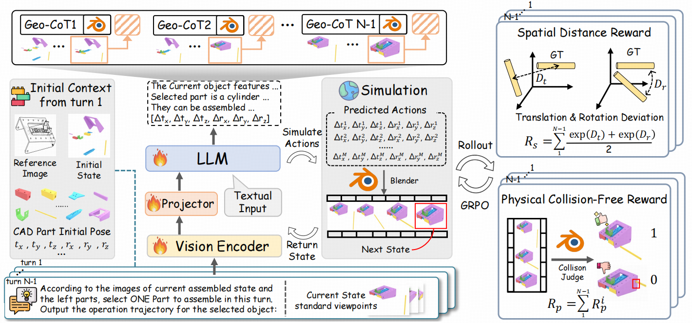 CADMATE: Generating CAD Assembly Plan with Geometric Chain-of-Thought and Spatial Physical Rewards