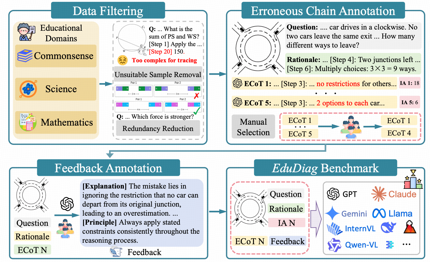 EduDiag requires models to reconstruct erroneous reasoning chains from students' incorrect answers and generate corresponding corrective feedback, spanning: commonsense reasoning, science, and mathematics.